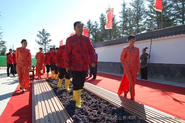 文章来源华夏酒报; 10月18日,12名身着古代唐装礼服、挽着发髻的青年男女,手提竹篮,走进丰收的山东蓬莱唐皇山谷葡萄园采摘葡萄,随后将篮子里盛满的葡萄倾倒在10米长的“葡萄之路”里,盛情邀请各方来宾走过“葡萄之路”,踩榨出葡萄汁酿造盛唐美酒。