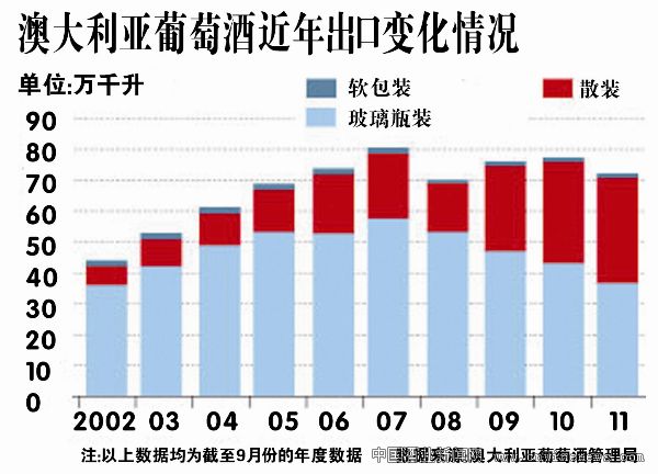 随着果香类型葡萄酒逐渐失宠和澳元的不断走强,澳大利亚葡萄酒出口额自2007年开始逐年下滑。澳大利亚葡萄酒管理局将其归咎于散装葡萄酒出口比例的上升,目前,散装酒在其出口总量中所占比例高达48%,而历史平均仅占20%。