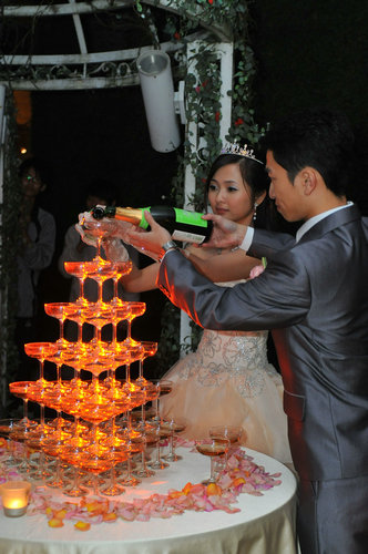 1.摆放香槟塔的平面基础很重要. 一般的香槟塔都摆在桌子上,桌子是否稳固是最重要的问题,对桌子的要求是:桌子面不能高低不平,四腿一定稳固。许多饭店都是临时搭婚礼舞台,用多块的舞台拼凑而成。由于舞台的长期使用,难免会出现不稳固的情况。如果香槟塔的桌子摆在舞台上,新人还要检查两块舞台交接的地方,两块舞台不能由于踩动发生撞击,而桌子也不能摆在两块舞台之间。那样香槟塔会同样不稳。