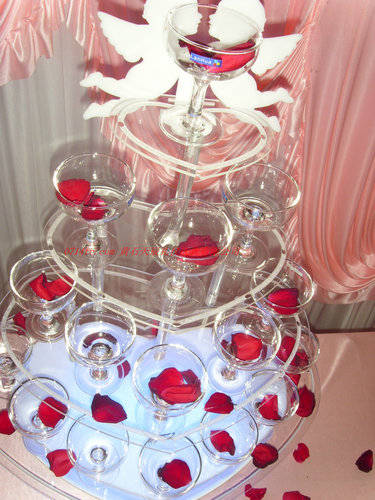 2.对香槟酒杯也有一定的要求.(红酒杯不行) 香槟酒杯的大小,高低非常重要.往往饭店的酒杯不是一次进货,很容易发生两批的酒杯不一样大或不一样高,而香槟塔对酒杯的要求比较高,相差一毫米都不行.摆放酒杯最基本的要求,是要求所有的酒杯必须紧靠在一起,中间不能抽出任何一个酒杯.新人要求饭店选择酒杯的时候,一定要提出此要求.最重要的提示,红酒杯不可以用做摆香槟塔,因为那种酒杯之间的接触面积小,摆出来瘦高瘦高的,不稳固,酒也流不进下面的酒杯里.