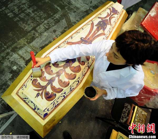 10月27日,莫斯科举行第10届墓地展,种类丰富、造型或精致或创意的棺材吸引了众人的目光。俄罗斯人讲究品味,就连坟墓也不例外。图为工艺师在装饰一副精致的棺材。