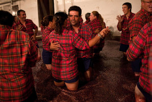 Grape pickers dance while treading on grapes in a traditional stone tank at Quinta do Vesuvio vineyard in Portugal. Sales of port wine sales have been falling steadily for years.