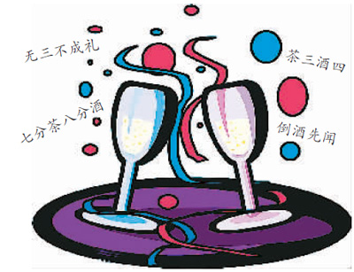 七分茶八分酒——就是指给客人沏茶只宜沏七分满,而斟酒以斟八成为宜。还有另外一层意思是,暗示喝酒的人不可贪杯过量,这样少斟节饮才既不会伤身体、出洋相,又不会造成浪费,这可谓古代斟酒中的“黄金分割法”。常言:“酒满欺客”,现代,两岸酒友在斟酒时更注重礼节与分寸,例如斟白兰地酒时,只倒三分之一杯或更少些;红葡萄酒倒至大半杯或更少。