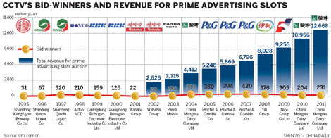 In 2010, the auction of prime-time ad slots raised 12.67 billion yuan in about 13 hours. The broadcaster generated 9 percent, or 40 billion yuan, of revenue in the TV ad market last year.