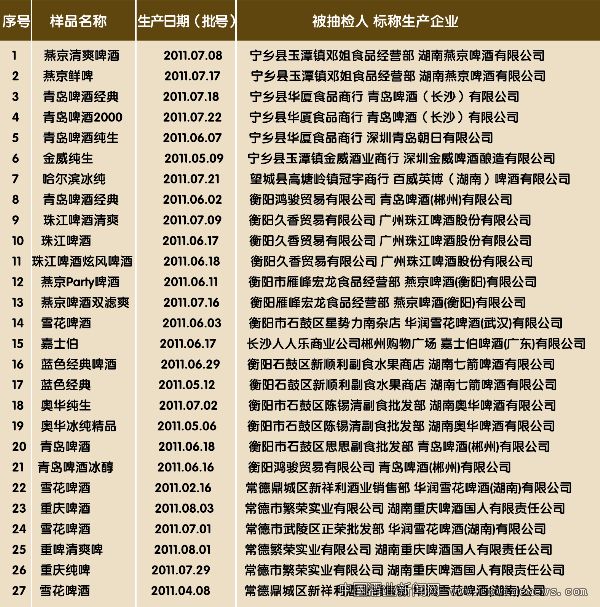 此次啤酒瓶抽检,在长沙、衡阳、郴州3地市的16家啤酒企业共抽取了40组样品。分别对抗冲击、耐内压力、瓶口内径等主要项目进行了检验,经检测,27组样品合格,合格率为文章来源华夏酒报67.5%。不合格项目主要为:一是抗冲击,共有10组;二是耐内压力,共有5组;三是瓶口内径,共有2组。(合格啤酒瓶名录见下表)