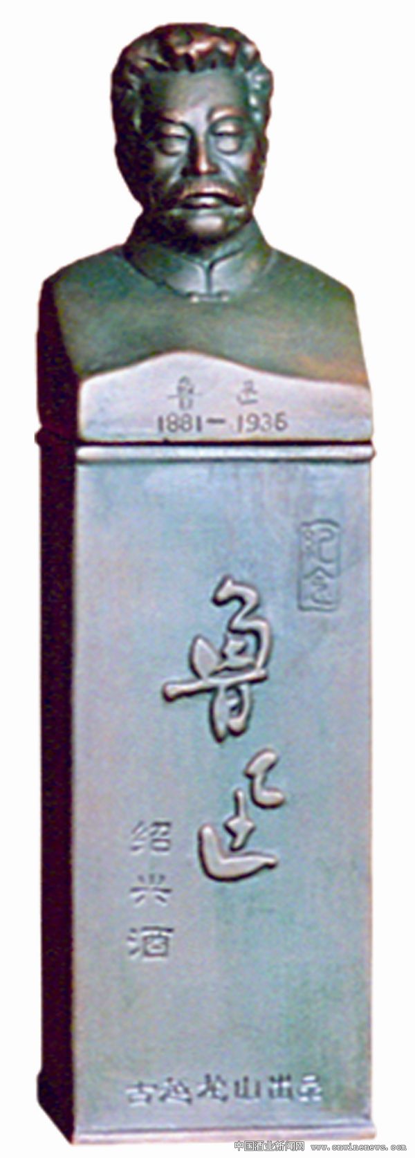 今年9月25日,是鲁迅诞生130周年(1881年9月25日—1936年10月19日)。鲁迅先生在世只有短短55年时间,1936年10月19日凌晨,鲁迅的“金不换”还搁在笔架上,眼睛却永远闭上了。从那时至今,他离开我们也有75年了。鲁迅原名周树人,字豫才,浙江绍兴人,“鲁迅”是1918年5月他创作发表《狂人日记》时首次使用的笔名,这是中国现代文学史上第一篇白话小说,大胆揭露吃人的封建礼教,奠定了新学运动的基石。看着这尊铜像,有一种特别的感觉,仿佛回忆书籍中、电视里鲁迅那张熟悉的面孔,黑色的头发竖起,面部神色冷峻,眼神中流露出冷光,鼻子高矗挺直,嘴巴上翘紧抿,上唇胡须硬齐,身着一件古式长袍对肩衣,布扣竖领,给人一种心底坦荡、凛然不可侵犯的大气印象。胸下还雕有生卒年代“鲁迅1881—1936”的字样。塑像基座上,直行分三排刻有“纪念 鲁迅 绍兴洒”的名称,“鲁迅”两字不但体大,行书流畅,而且是浮雕,其他五字和下面横排的“古越龙山出品”为凹雕,以彰显其名。