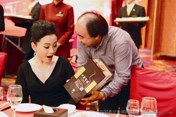 在第20届中国金鸡百花电影节闭幕式冷餐会上,安徽古井贡酒股份有限公司总经理梁金辉代表古井人送给了最佳女主角获得者娜仁花一份特别的礼物——刻有“第二十届金鸡百花电影节明星纪念酒娜仁花女士鉴藏”字样的古井贡酒。