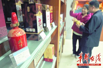 11月21日,记者来到了长沙市芙蓉中路的国誉酒业湖南旗舰店,该店主要经营中高档及顶级酒类品牌。记者仔细数了店内白酒专柜共有13个,而湖南本地品牌专柜仅有5个。该店还设置了中国十七大名酒专区,但仅有湖南一个品牌在列。品牌最多的是四川,有6个,分别为五粮液、泸州老窖、全兴大曲、剑南春、郎酒、沱牌曲酒。其次是贵州的茅台、董酒 ,山西的汾酒、西凤酒,河南的宋河粮液、宝丰酒,江苏的洋河大曲、双沟大曲。最后是湖北黄鹤楼、安徽古井贡酒和湖南的武陵酒。