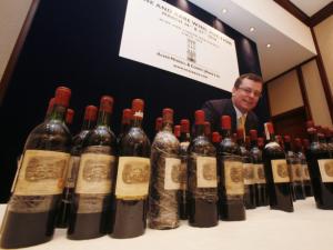 Acker Merrall & Condit's President and Auction Director John Kapon poses with a lot of 70 "Four Centuries of Chateau Lafite Rothschild" bottles, which includes bottles between 1799 and 2003.