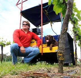 NUMBER 8 GENIUS: Douglas Haynes of Hawkes Ridge Wine Estate with his prizewinning de-budding spray unit. Labrador Trinity aka Doodle finds the sprayer handy for rabbit patrol.PHOTO/PAUL TAYLOR HBT114145-01