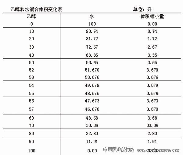 不同比例的乙醇和水混合成100升乙醇溶液,所需的乙醇和水的升数及缩小量(见表1)。当53.94升的乙醇和46.83升的水混合时,达到体积缩小的最大值为3.779升,这时酒度为53度—55度左右。缔合度越大,酒精分子的自由度越小,酒的柔和度增强。