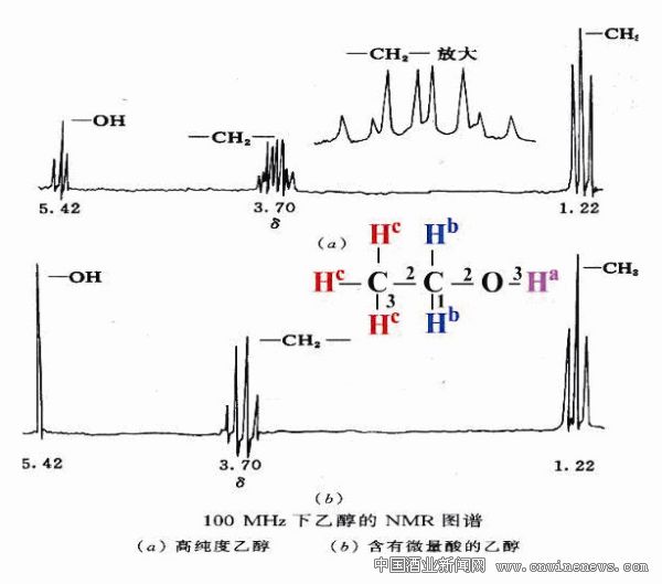 酒饮料中由于含有酸、醇、酯、醛、酮、芳香化合物等,氢键的结合,不仅仅是乙醇—水之间氢键的结合。研究表明,乙醇与水分子结合的疏密程度与酸和多酚密切大关系。向60%乙醇水溶液加入乙酸,随着酸浓度的进一步增大,化学位移向更低磁场方向移动,促进了水与乙醇之间的质子交换,同时形成了更加井然有序的水—乙醇溶液的结构特征。