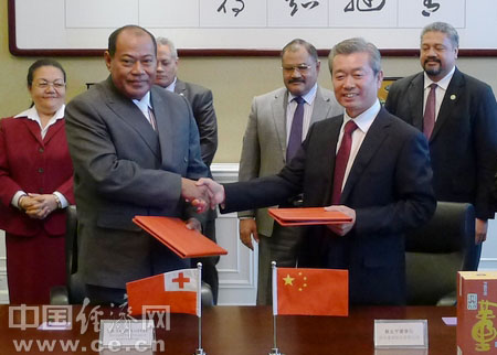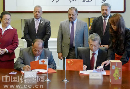 汤加王国副首相萨缪·瓦普鲁在北京与中国董酒董事长蔡友平正式签约
