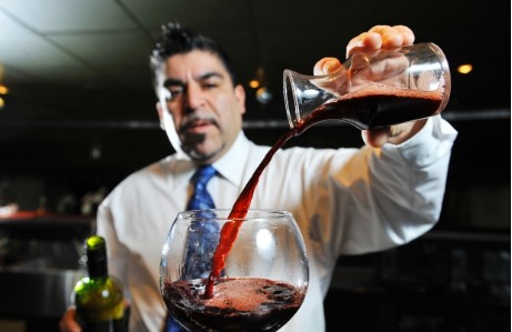 Erick Rosende measures wine in a carafe before pouring it into a glass. Rosende is the director and head instructor at Ultimate Bartending School.