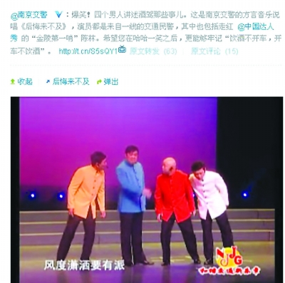 昨天上午,“南京交警”微博贴出了一段说唱视频,题目就是《后悔来不及》。内容笑点十足,四个演员分别饰演四名司机,表演了他们在酒桌上的丑态,以及酒后驾车后引发的悲剧。比如,有一位演员表演的是一名37岁的货车司机,经过多年的拼搏,好不容易娶了一个老婆。八月十五的那天,他开车带着老婆走亲戚,和几个亲戚轮流喝酒,你敬三杯,我就要敬六杯。喝完酒之后,再开车上路,被交警查到,结果拘留了15天。
