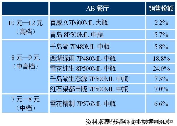 在AB类餐厅中,主要以中高档啤酒为主,中高档啤酒占了六成以上的份额。而雪花纯生恰恰属于中高档啤酒,且在中高档啤酒市场中排名第一,竞品主要有千岛湖生态源(7.3%)和千岛湖7P中瓶(5.8%),及红石梁都市版(7.0%)。