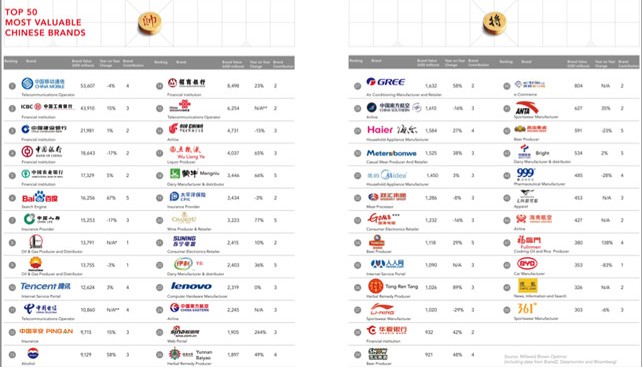 The BrandZ rankings include mainland China companies owned by a publicly traded enterprise. They are based on published financial data and surveys of more than 35,000 Chinese consumers.