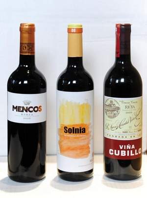 2009 Conde de Hervias Mencos, 100% Tempranillo, unoaked, $15; 2008 Bodegas y Vinedos Ilurce Solnia Rioja, 50% Tempranillo 50% Graciano, $13; 2005 R. Lopez de Heredia Rioja Crianza Vina Cubillo, 65% Tempranillo, 25% Garnacha with Mazuelo and Graciano, $30. / Samuel Simpkins/The Tennessean/Samuel M. Simpkins