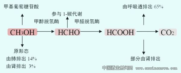 由于甲醇氧化分解慢,从体内排出也慢,因此在人体内毒性作用也较强。未被氧化的甲醇可经呼吸道及肾排出体外,另一部分也可经胃肠道缓慢排出。甲醇代谢途径如图所示。