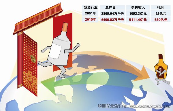 入世十年,中国酒业的个头儿变大了。2001年酿酒行业实现总产量2869.04万千升、销售收入1092.3亿元、利润62亿元;到2010年则分别为6499.83万千升、5111.4亿元、530亿元,各项经济指标均几倍于2001年。我国的啤酒年产量已经连续9年居世界第一位。2010年中国企业500强榜单中,有15家酒类生产和流通的相关企业。十年来,酒业的技术、装备、节能减排、环境保护、综合利用、人才培养的水平有了极大提高。