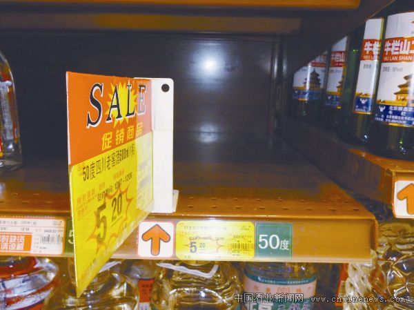 记者在烟台某家超市的酒水区停留了十几分钟,一款名为“四川老窖”的白酒,因为其5.2元/瓶的超低价很快就销售完了,一位消费者一次就购买了6瓶。他告诉记者,像他这个岁数的老年人平常都爱喝点小酒,但是现在经常喝的几款酒价格都有所调整,正在考虑换其他的品牌尝尝。而另外一款9元/瓶的四川绵竹大曲的货架上早就标出了“货已售罄”的字样。