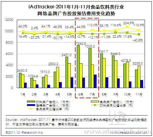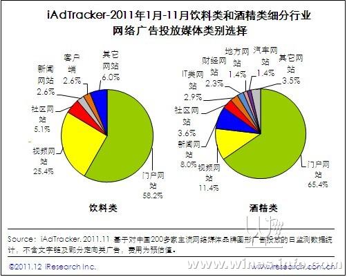 iResearch艾瑞咨询根据网络广告监测系统iAdTracker的最新数据研究发现,在社会消费品零售总额稳步提高的背景下,食品饮料类2011年1-11月的广告投入同比稳定增长至 10.5亿,较去年同期增加24.1%。其中,由于饮料产品的季节性需求,其广告投放相对集中于夏季。而除啤酒外的酒类年末和春节营销意愿较强。媒体类别选择上,食品、饮料和酒精类产品媒体选择各有侧重,酒类产品对于男性群体聚集网站的广告投入把握恰当。