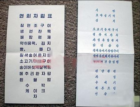 餐桌上预备的菜单:有野芝麻烤牛肉、鳗鱼冻等一般百姓生疏的山珍海味。鱼冻,百叶,烤火鸡,鱼冻,百叶凉菜,药凉糕,泡菜,面包,苏打饼,七色鳟鱼菜包,烤孜然牛肉,蟹肉炒松茸菇,鹌鹑丸子汤,黄米饭,西瓜,蛋糕,茶,南瓜蒸糕,泡菜,苏子烤牛肉,鳗鱼冻,水果拼盘,人参鸡汤,小米饭烤七色鳟鱼,香菜汁猪腿,蘑菇松针炖鳟鱼,平壤冷面,水果,民族糕点,柠檬奶油,人参茶。