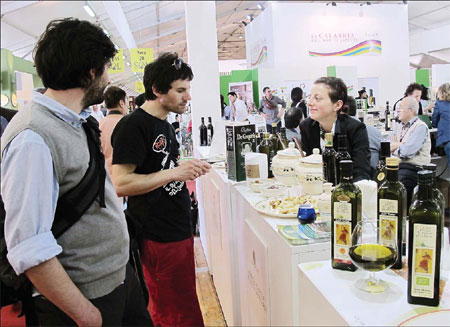 Visitors taste wine and olive oil at Vinitaly, the biggest wine expo in Italy. Photos by Ye Jun / China Daily