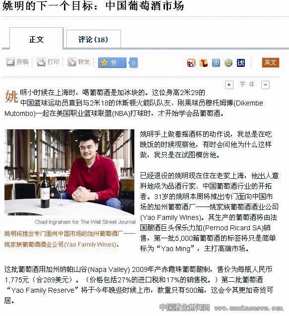 姚明逐渐学会品味葡萄酒时,他的祖国也逐渐地接受了葡萄酒。从2005年到2009年,中国的葡萄酒消费量翻了一番。但中国进口的葡萄酒主要来自法国,于是姚明发现了加州葡萄酒的一个市场机会。