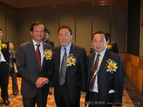 海南省副省长李国梁(中)向青岛啤酒公司总裁孙明波(左)、澄迈县委书记杨思涛(右)祝贺项目签约成功