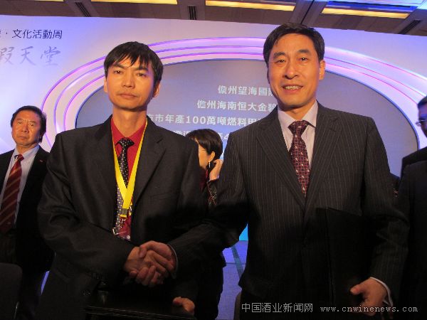 青啤公司副总裁黄克兴(右)与海南澄迈县文章来源中国酒业新闻网领导王斯(左)签约年产40万千升啤酒生产基地项目