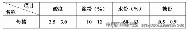 选用发酵期为60天,发酵正常的母糟,糟醅呈暗红色,有骨力。其出窖化验各项指标见表1。