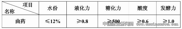 选用中高温曲为糖化发酵剂。制曲顶火温度为60℃—62℃,其各项化验指标见表2。