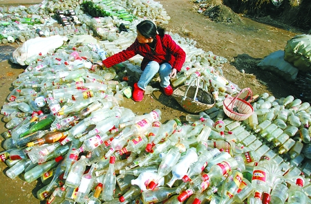 一废品收购站工人在整理回收的酒瓶 CFP 图