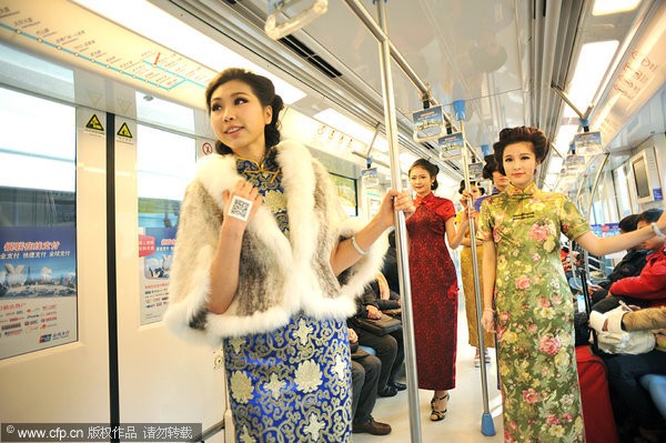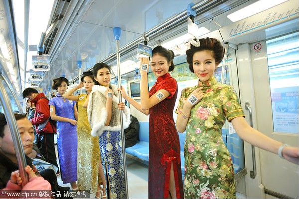 Women in qipao pose on the subway in Nanjing, Jiangsu province on Jan 11, 2011. [Photo/CFP]
