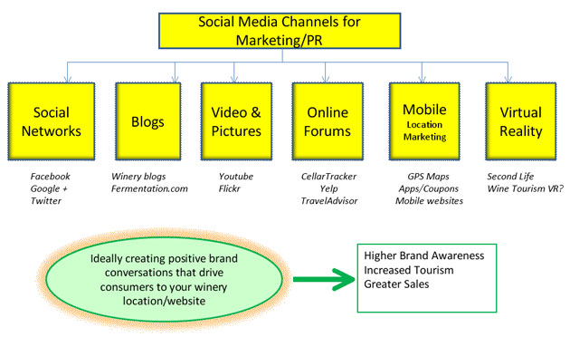 Social media can be defined as “Internet-based applications that allow the creation and exchange of user-generated content (Kaplan & Haenelein, 2010).” In the past 5 years the different types of social media have expanded rapidly, and it has become complicated to determine which tools are best for wineries to use. One method to address this issue is to divide social media into six channels for marketing and public relations as illustrated in Figure 1.