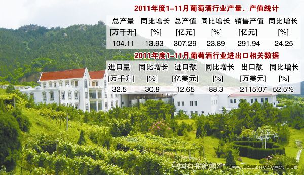 据中国酿酒工业协会统计数据显示:2011年1月—11月,全国葡萄酒产量为104.11万千升,同比增长13.93%。其中第一季度葡萄酒产量为24.89万千升,同比增长25.7%,第二季度葡萄酒产量为25.21万千升,同比增长16.44%;第三季度葡萄酒产量为30.2万千升,同比增长17.93%。