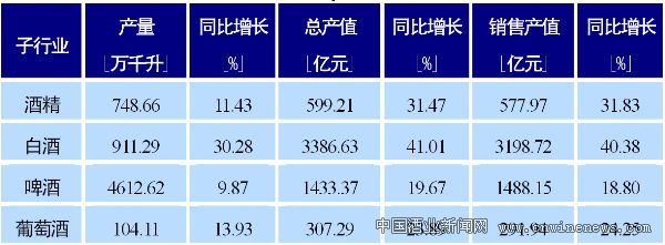 根据中国酿酒工业协会最新披露的数据显示,2011年1月—11月,酒精行业实现产量748.66万千升,同比增长11.43%,饮料酒行业实现产量5815.26万千升,同比增长12.96%,其中白酒行业实现产量911.29万千升,同比增长30.28%,年内突破1000万千升已成定局,经济效益大幅增长,利润、利税等方面均创新高。
