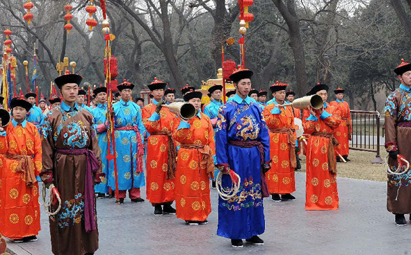 Performers wearing costumes of the Qing Dynasty (1644-1911) act during a rehearsal of a performance presenting the ancient royal heaven worship ceremony in the Tiantan Park (Temple of Heaven) in Beijing, capital of China, Jan 16, 2012.[Photo/Xinhua]