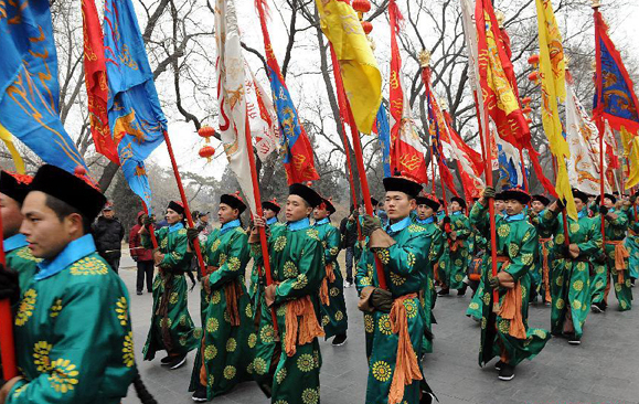 Performers wearing costumes of the Qing Dynasty (1644-1911) act during a rehearsal of a performance presenting the ancient royal heaven worship ceremony in the Tiantan Park (Temple of Heaven) in Beijing, capital of China, Jan 16, 2012.[Photo/Xinhua]