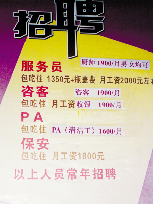 路桥某酒店招聘启事中明确写着工资包含“瓶盖费”。 何 诚摄