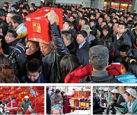 Clockwise from top: Passengers at the Beijing Railway Station head home for the lunar new year. Most Chinese factories will close for the holiday week after a burst of productivity. These women at a garment factory in Huaibei, Anhui province, make goods for export to the United States. Plans for family reunion meals prompt people like this couple in Binzhou, Shandong, to stock up on supplies. Decorations, like these in Fuyang, Anhui, set the atmosphere for lunar new year. Wang Jing / China Daily Lu Qijian / for China Daily Provided to China Daily