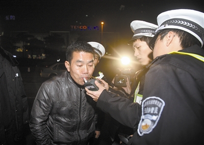 1月27日晚,交警在厚街查车,一名司机正在接受酒精测试 东莞时报记者 周天宝 摄