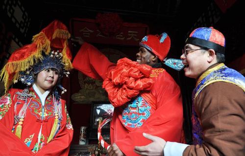A Ghanaian student (C) plays the bridegroom in a Chinese wedding ceremony simulation held in Zibo, East China's Shandong province, Jan 23, 2012, the first day of the Chinese Lunar New Year. Some 70 foreign students from more than 30 countries and regions celebrated the Chinese Spring Festival with local people in Zibo. (Xinhua/Dong Naide)
