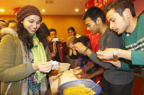 Foreign students learn to make dumplings in a hotel of Zibo, East China's Shandong province, Jan 22, 2012, the last day of the Chinese lunar Year of Rabbit. Some 70 foreign students from more than 30 countries and regions celebrated the Chinese Spring Festival with local people in Zibo. (Xinhua/Zhang Hongxia)