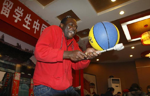 A foreign student learns to perform acrobatics in a hotel of Zibo, East China's Shandong province, Jan 22, 2012, the last day of the Chinese lunar Year of Rabbit. Some 70 foreign students from more than 30 countries and regions celebrated the Chinese Spring Festival with local people in Zibo. (Xinhua/Zhang Hongxia)