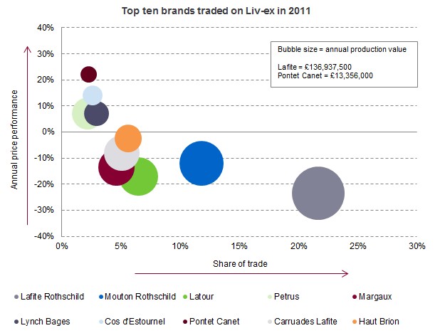 Many of these falls were concentrated in the First Growths, which did not relinquish their dominance over the market. This is demonstrated in the chart below, which shows the performance and production value (i.e. average price x production) of the top ten labels by value traded on the exchange in 2011. It wasn’t universally bad news as many of the second-line wines and Petrus managed to end the year slightly up.