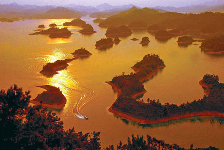 The tranquil waters of Thousand Island Lake in Zhejiang province, bathed in the golden glow of sunset. (Photo source: China Daily)