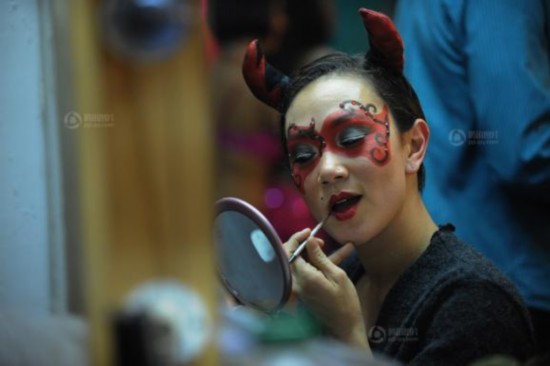 半场演出结束,演员对着镜子补妆。