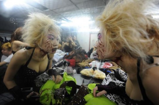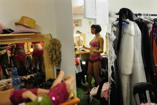 狭小的空间里,女孩们在候场。一晚的演出,她们通常要换好几次服装。